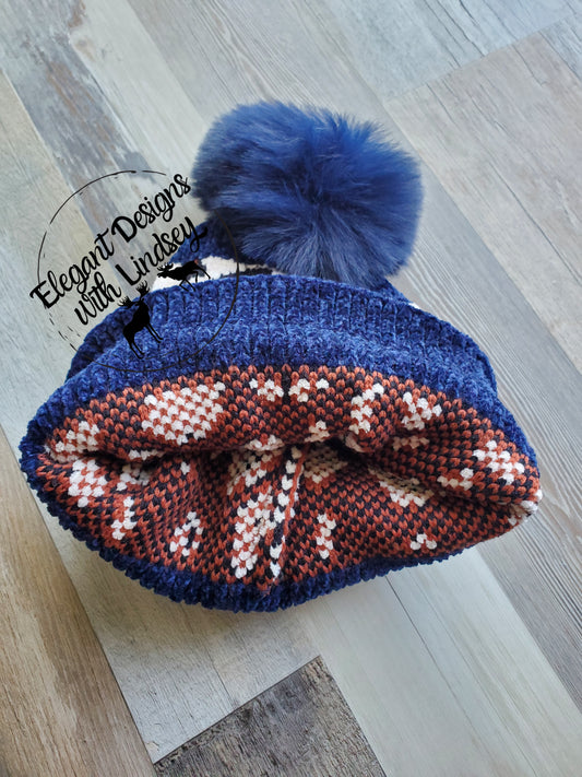 Navy Leopard print winters hat with pom