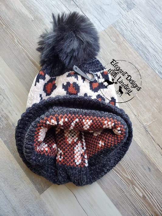 Black Leopard print winters hat with pom