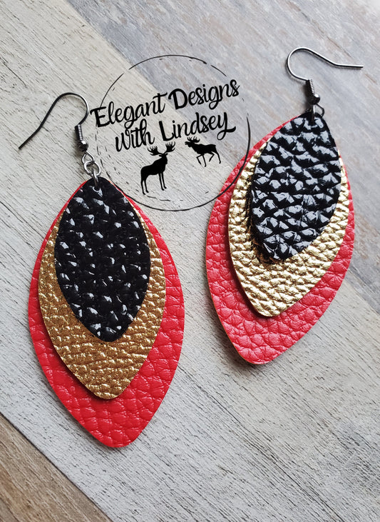 Red/Gold/Black 3 Layer Faux Leather Earrings