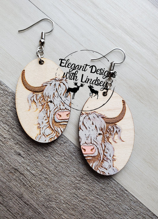 White Wash Hyland Cow Hand Painted Wood Earrings