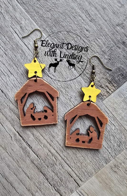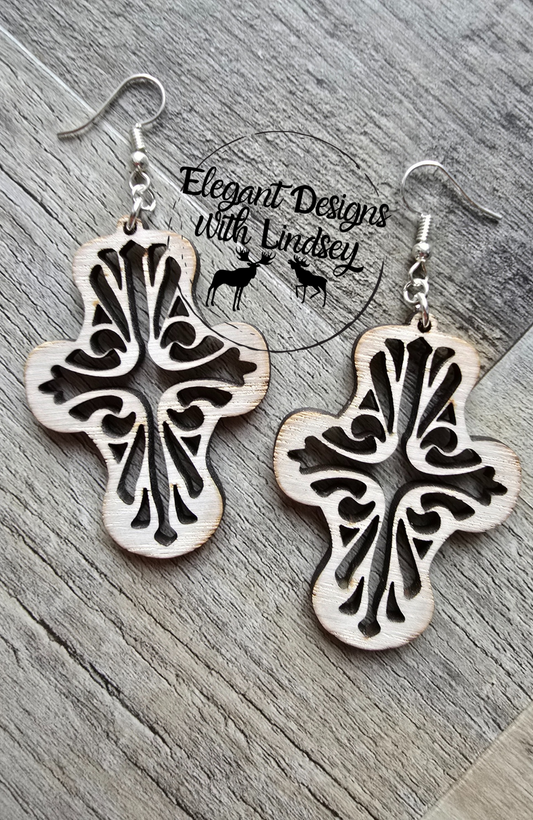 Grace Round Dial Cutout w/Cross Wood Post Dangle Earrings