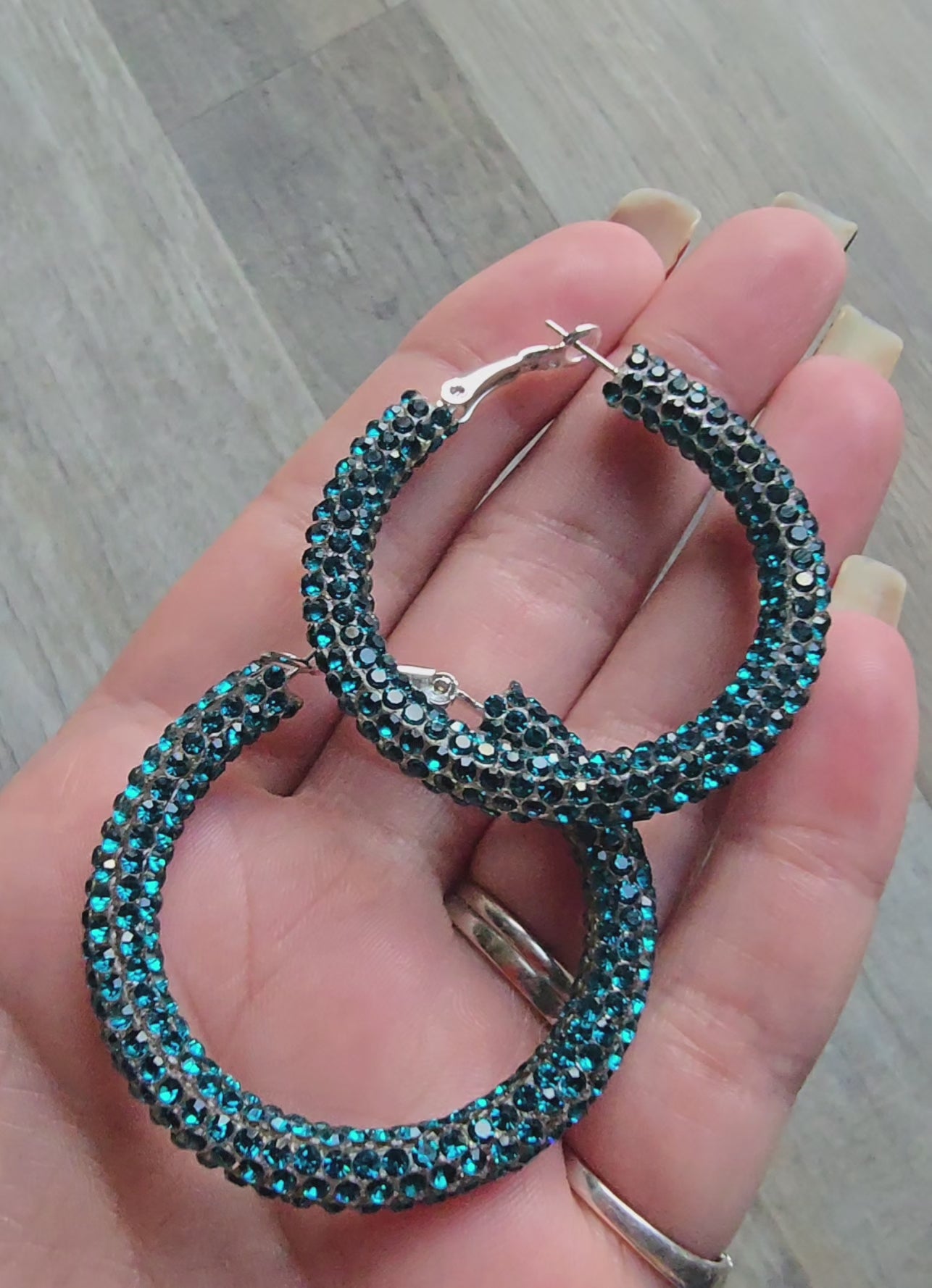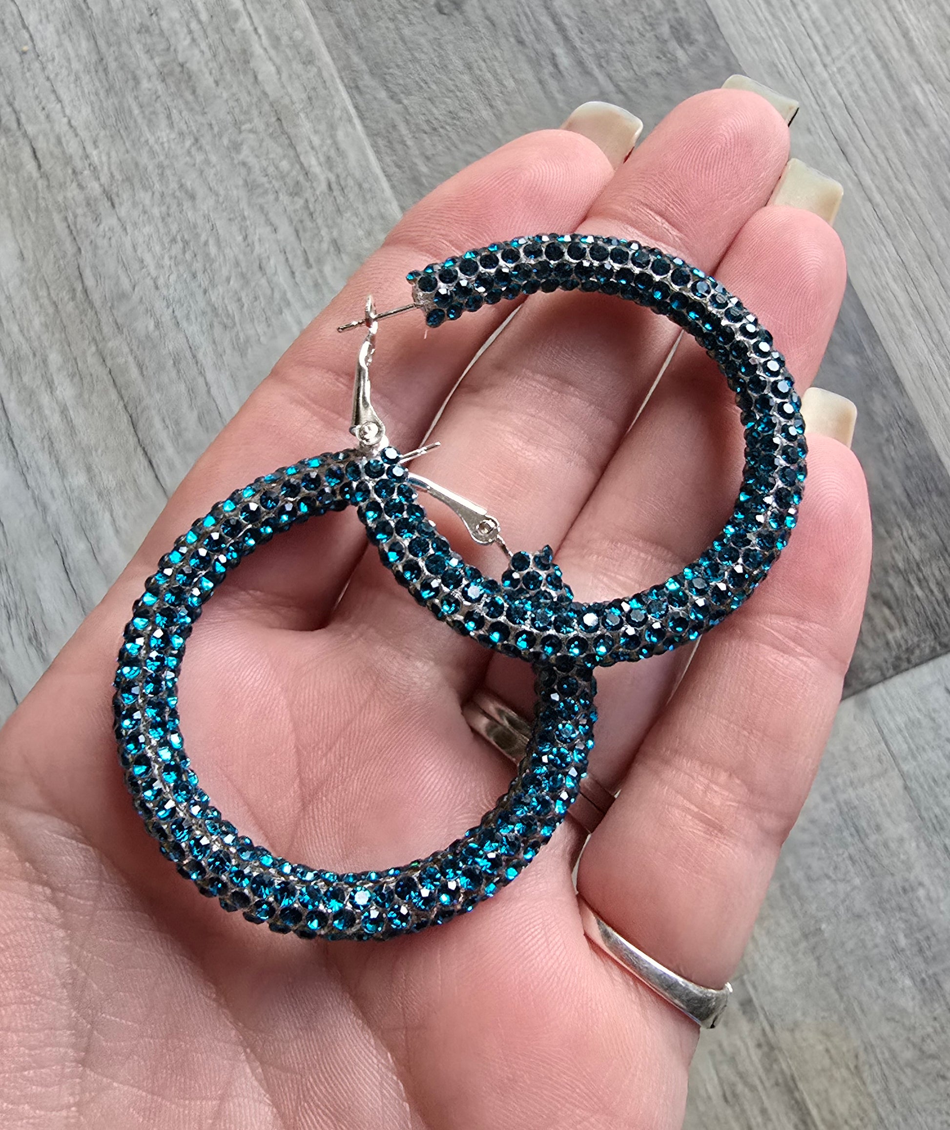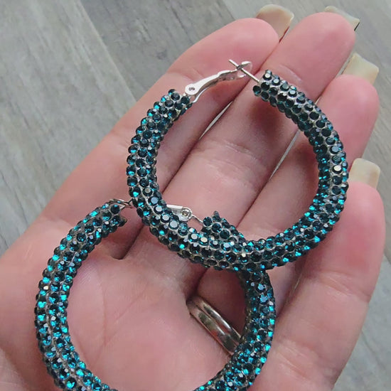 Experience the stunning beauty of Deep Turquoise Rhinestone Hoop Earrings, available in three different sizes: Small (30mm/1.18 inch), Medium (40mm/1.57 inch), and Large (50mm/1.96 inch)