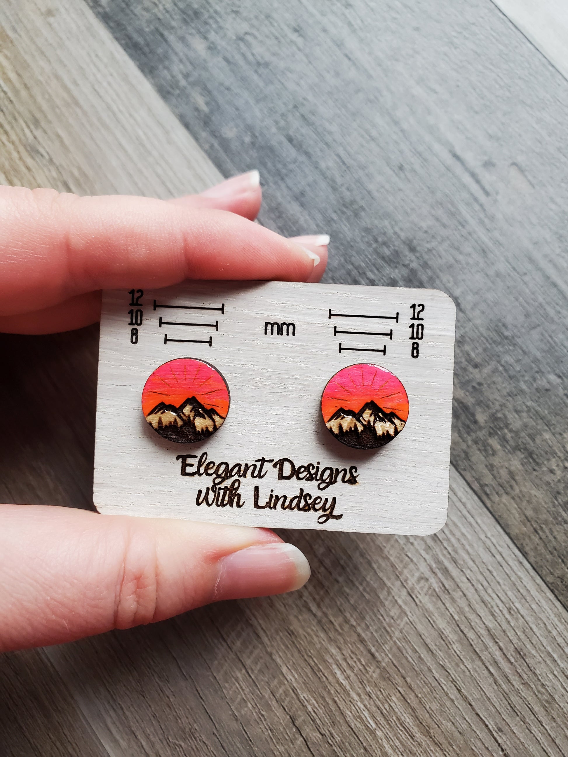 Pink/Orange Mountain Sunset Painted Wood/Resin Stud Earrings